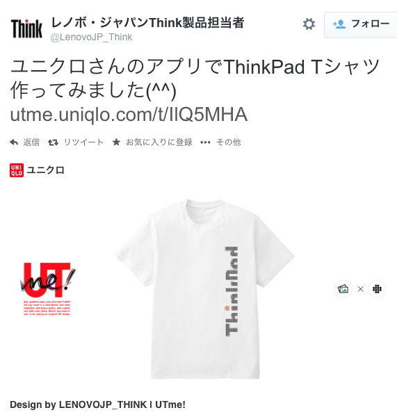 ユニクロさんのアプリでThinkPad Tシャツ作ってみました(^^) http://utme.uniqlo.com/t/IlQ5MHA