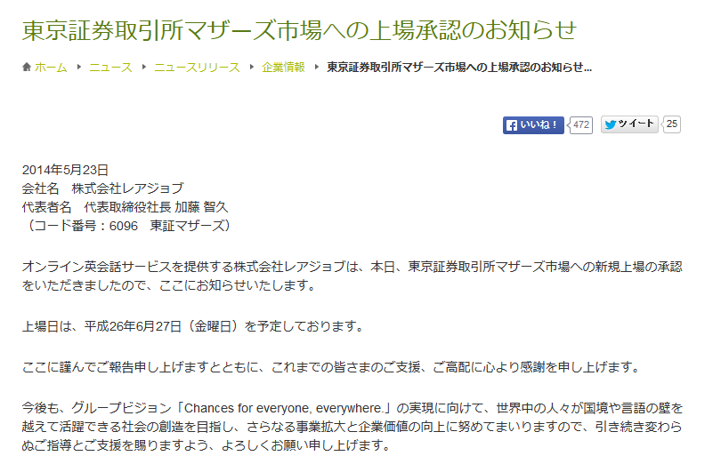 レアジョブ 設立(2007)⇒会員数が10万人を突破!(2012)⇒3.3億円増資(2013/6)⇒1億円赤字クソ決算(2014/3)⇒\∧∧∧マザーズ上場∧∧∧/←イマココ
