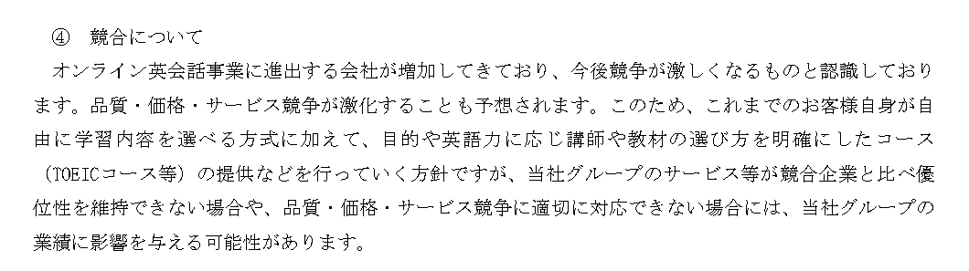 オンライン英会話事業に進出する会社が増加してきており、今後競争が激しくなるものと認識しております。