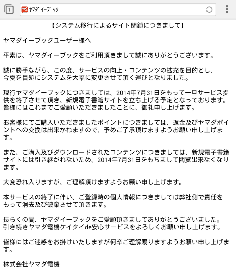 久々にヤマダ電機の電子書籍アプリを立ち上げたら何だかショップに不穏なメッセージが