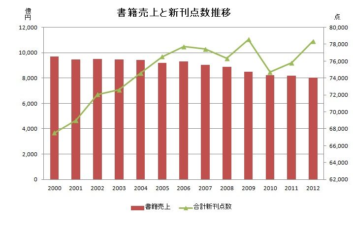 総売上が落ちてる(=市場がシュリンクしてる)のに、商品(新刊)の数を増やしたら、商品あたりの売り上げが落ちる(=本が売れなくなったとか言われる)のは当たり前ですよね。