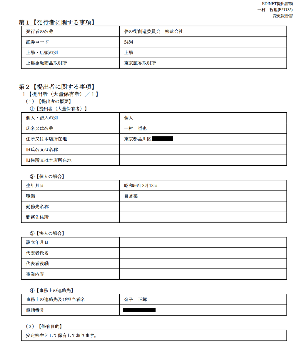 — Kyosuke Yoshimura (@kyosuke25) 2013, 7月 22[大量保有報告]<2484>夢の街創造委員会 2013年7月22日 14:24に一村 哲也が提出 保有割合 7.21% http://t.co/UdIfzpD7FI