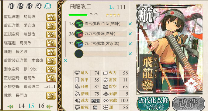 練度の極めて高い正規空母「飛龍」の【改装(改造)】が可能となります。