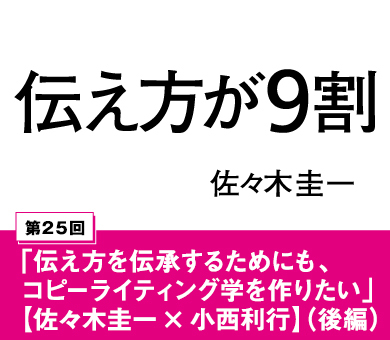 博報堂時代、コピーライターとして同じ環境で働いた小西利行氏と佐々木圭一氏。2人の思いは「コピーライティング」や「伝え方」を技術として伝承していくことに一致していく。昔も今も「時代」と関わり続ける2人の、言葉に対する熱い思いが伝わります。