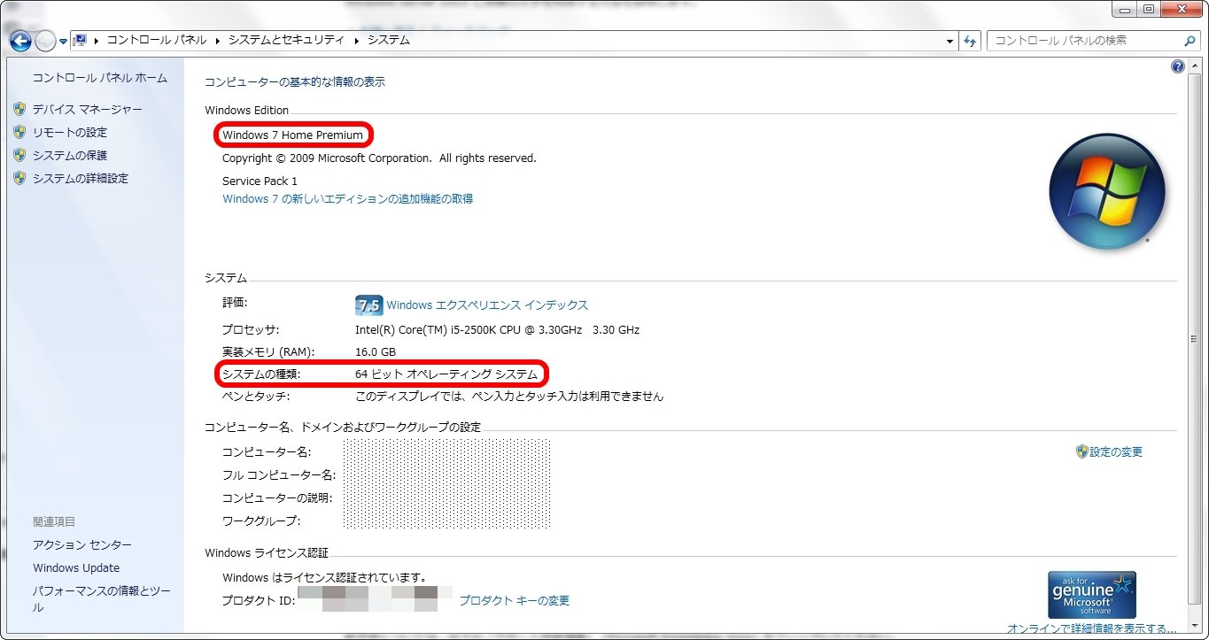その下の方に表示されているのが64bitや32bitといったシステムの種類となる。