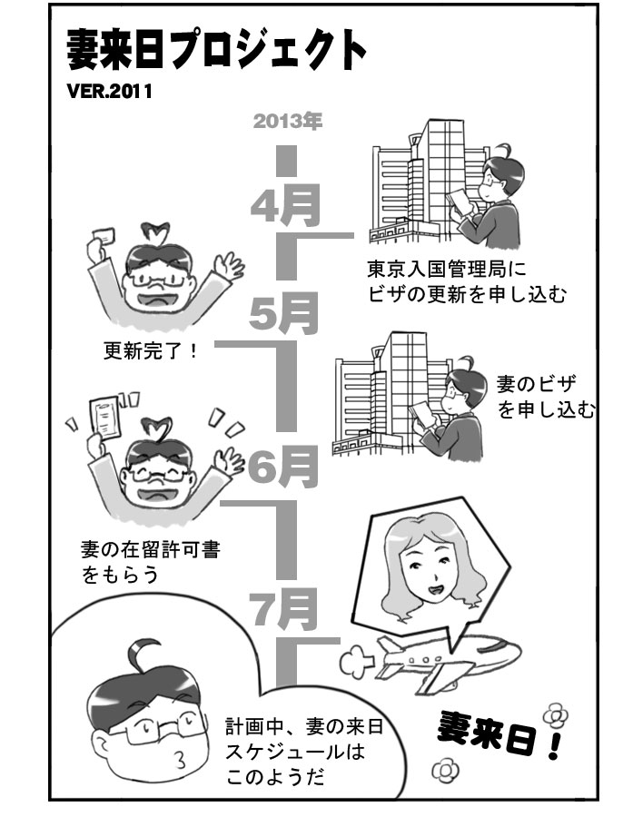 2013年4月、来日前の計画によって、専門学校に入ると「妻来日プロジェクト」を始まる