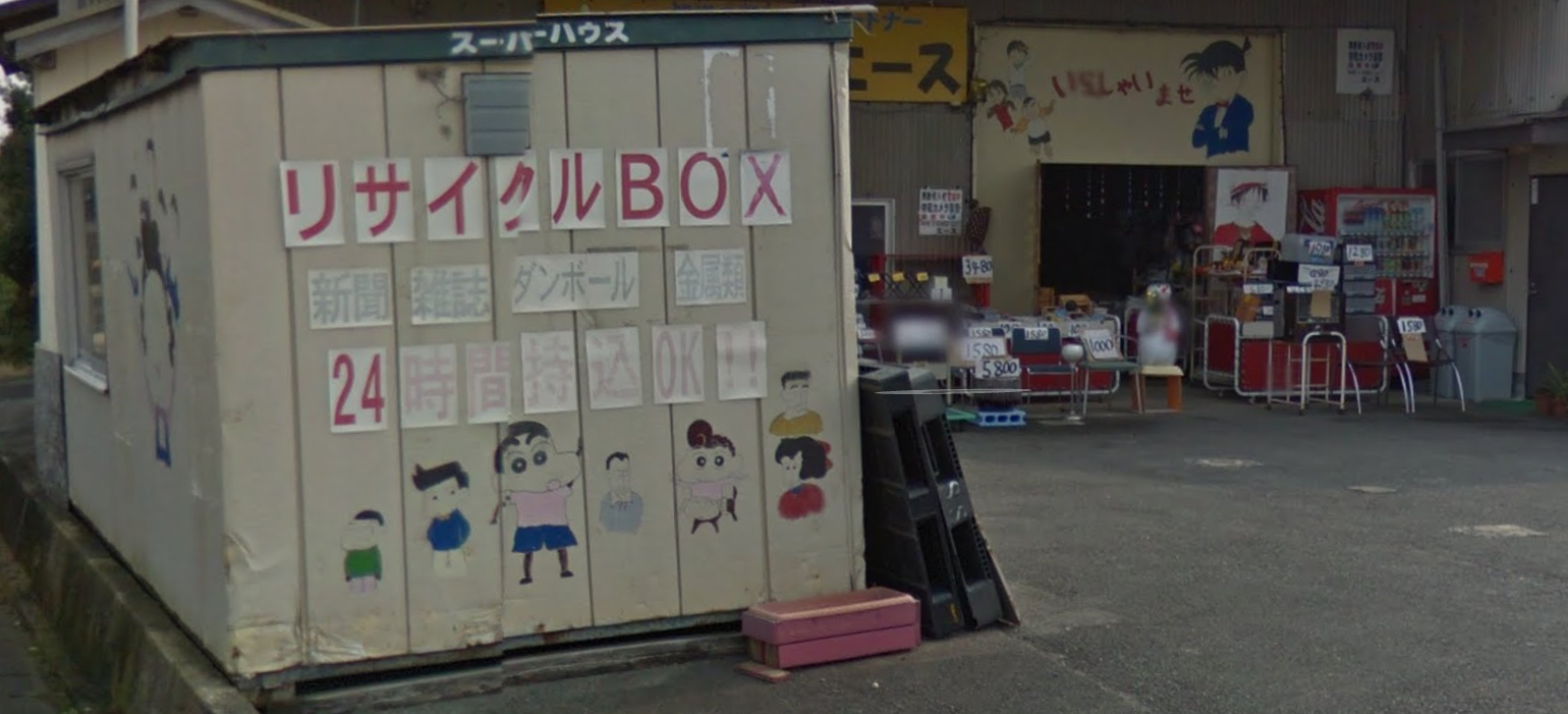 お店の壁にクレヨンしんちゃんにコナンのマスコット絵