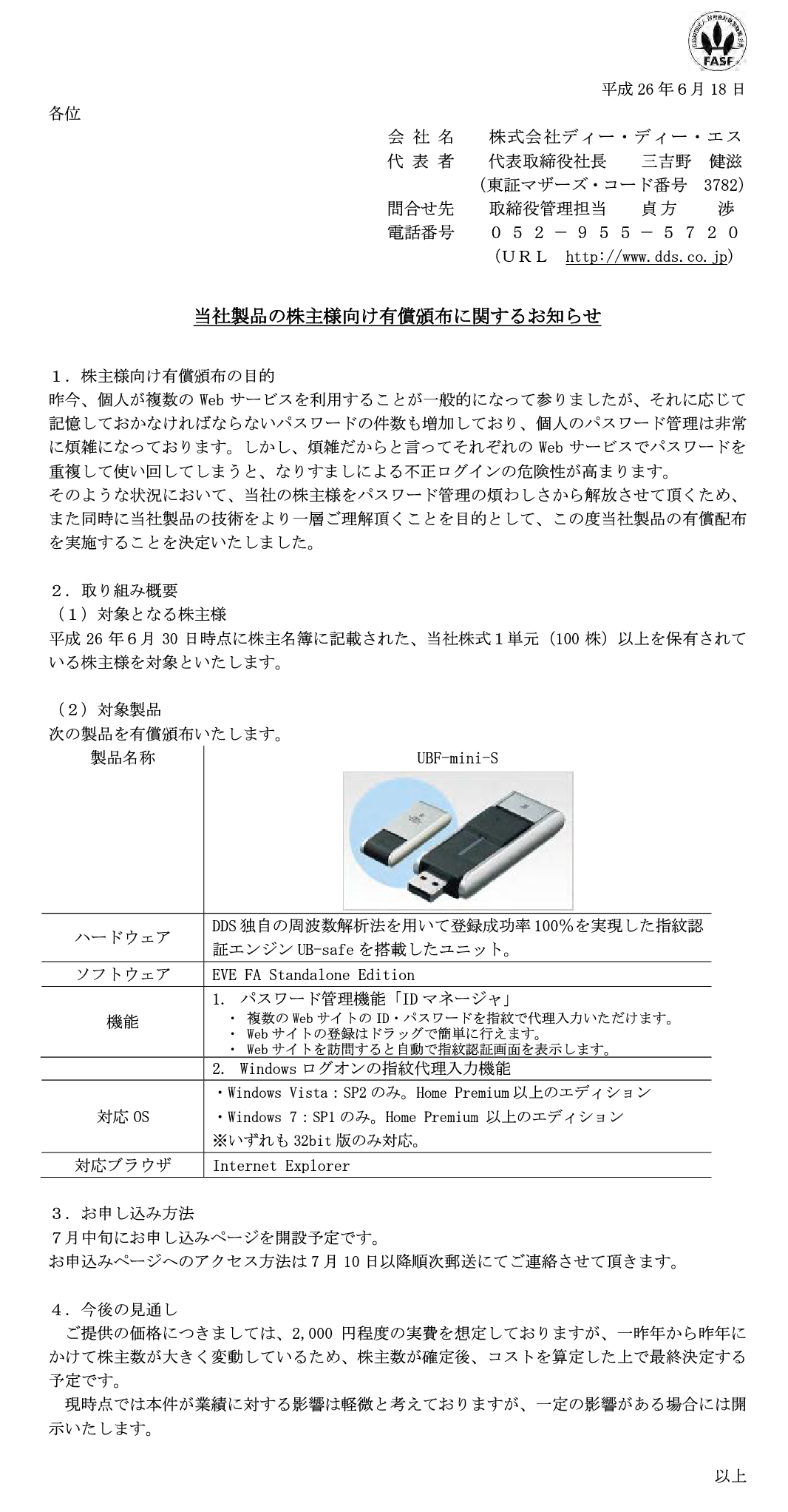 2014/06/18 17:30 DDS 当社製品の株主様向け有償頒布に関するお知らせ