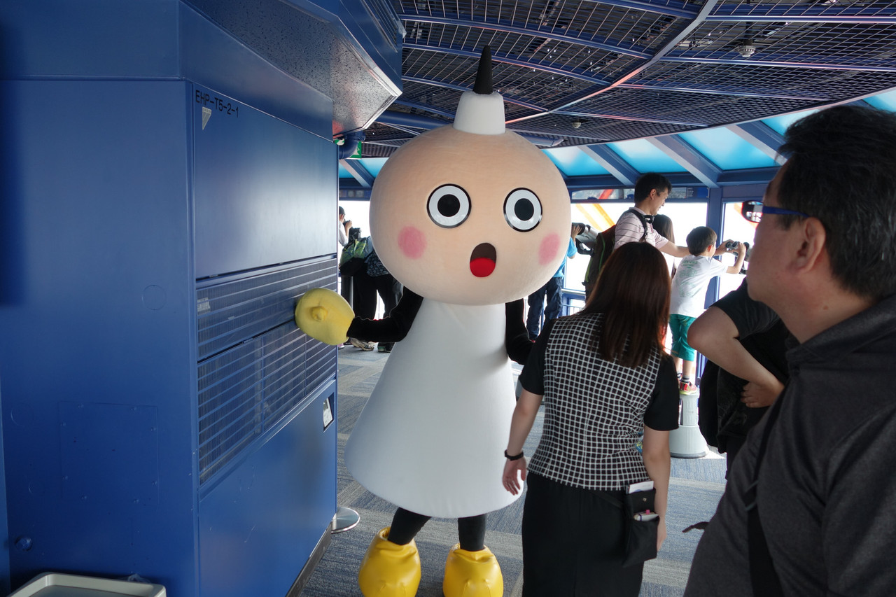 撮影中にやたらと絡んできた、京都タワーのゆるキャラ、たわわちゃん。