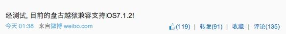 「经测试, 目前的盘古越狱兼容支持iOS7.1.2!」