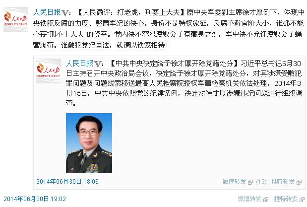 6月30日、習近平総書記が政治局会議を主宰。中央軍事委紀律検査委員会による『徐才厚の重大な紀律違反に関する審査報告』の聞き取り、及び『中国共産党規約』『中国共産党紀律処分条例』の関連規定に基づき、徐才厚に対し党籍剥奪処分を決定した。