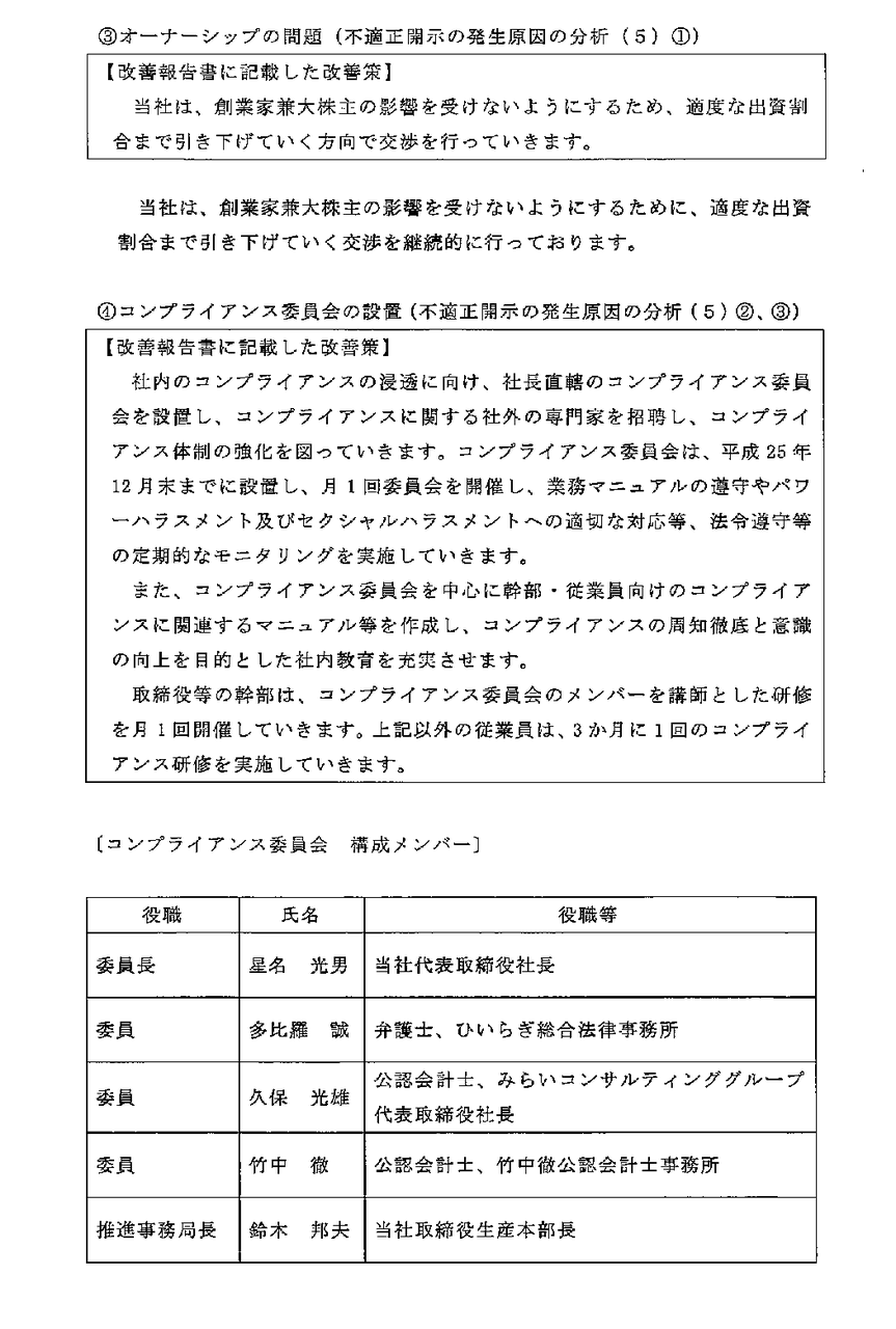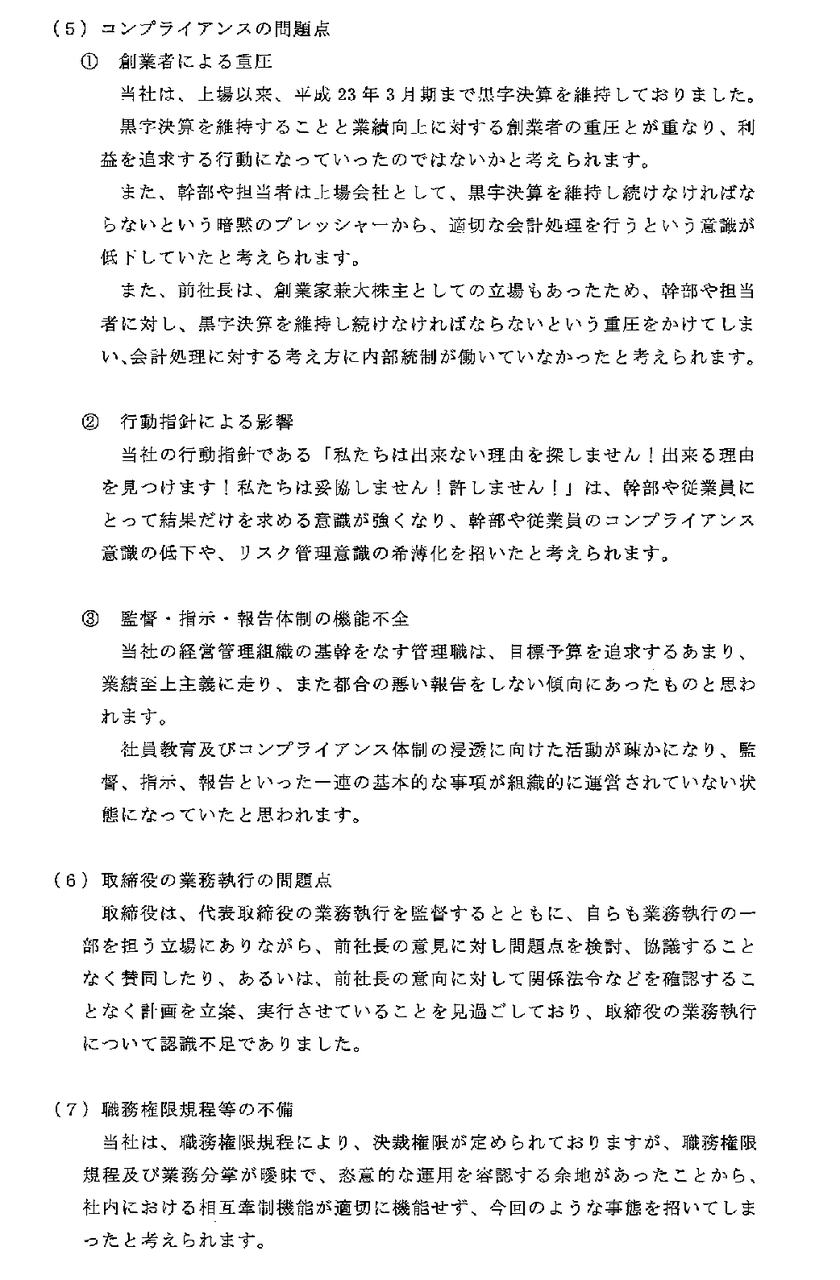 昨年11月に東証に提出された社内調査委員会報告書は、「黒字決算を維持することと業績向上に対する創業者の重圧」「当社の行動指針…は、コンプライアンス意識の低下や、リスク管理意識の希薄化を招いた…」と、刺激的な内容でした。