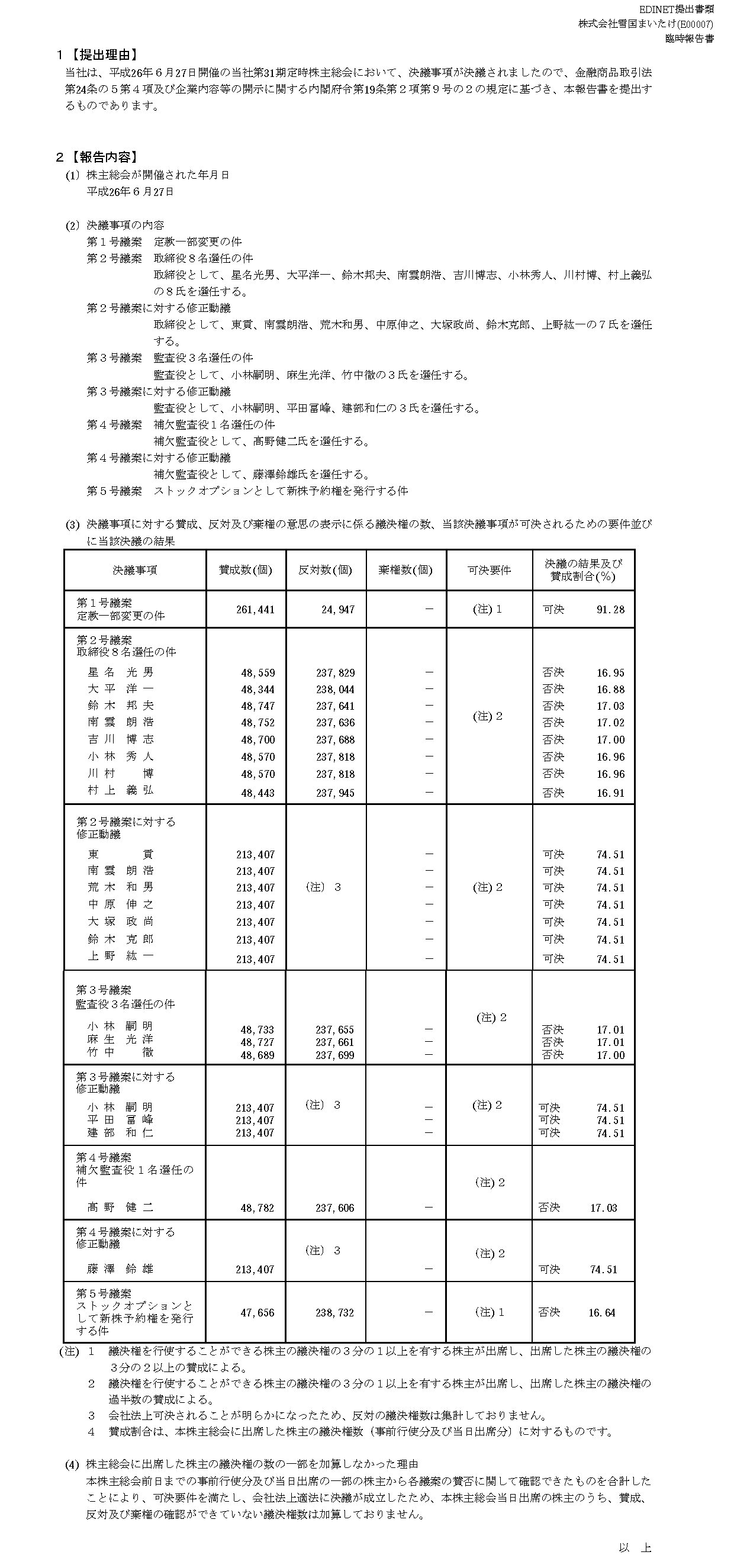 先月、「4/25社外監査役が逝去、4/13補欠監査役も逝去していたため、5/7仮監査役選任」と紹介しましたが、その仮監査役・竹中氏の監査役選任も否決。