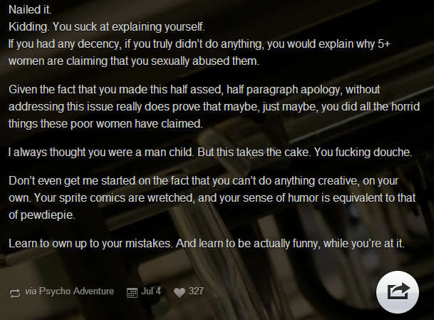 All in all, tumblr does not seem satisfied with the short apology that PsyGuy provided, so this may not be the end, but one thing is for sure, as the master post points out "PsyGuy is extremely toxic at best".