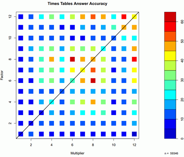 5~8(学)年の生徒が掛け算でどこに最も手こずっているか可視化した結果。