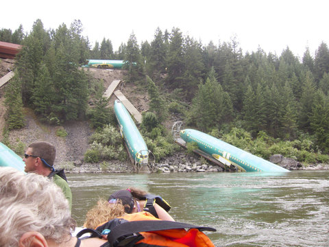 が線路の土手に落ちており、そのうち2つが線路の下方のクラークフォーク川に部分的に水没している。