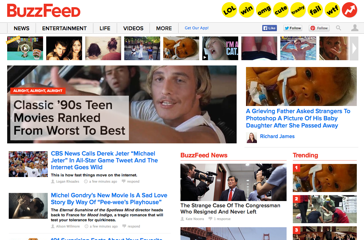 このメディアの大きな意義については、いわゆる大きめのソーシャルボタンのフォーマットを広めたことだと思います。有名なエピソードとしては1本の記事に対して25個のタイトルを考えているというものです。それだけソーシャルに最適化した戦略を撮っている。タイトルの重要性をものすごく追求したメディアになっています。
