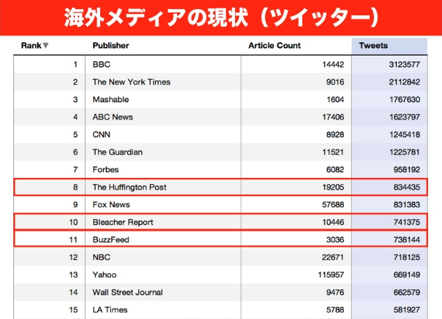 次はTwitterの情報。Facebookに比べるとTwitterはバイラルメディアが3つしかランクインしていなくて少ない。やっぱり大手が多い。ハフィントンだったりBuzzFeedがランクに入っている。