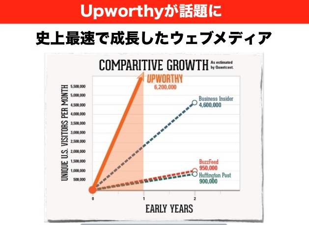 Facebookに最適化したので、BuzzFeedに比べると倍くらいの「いいね!」がついています。これも1枚のグラフでとてもわかりやすいんですけど、史上最速で成長したと言われています。ハフィントン・ポスト、BuzzFeed、ビジネスインサイダーなど海外の新興系の勢いあるメディアよりもさらにスピード感のある成長をしたということで、話題を呼びました。