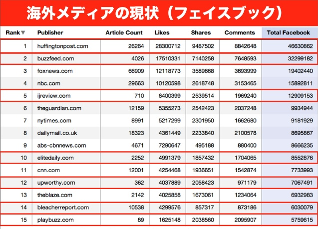 この2つの情報をまとめてみるとFacebookの方はトップ15のうち7つがバイラル系。記事数は伝統メディアに比べて少ないんですけど、ソーシャルメディア上、Facebook上での存在感はすごく大きい。Yahoo!、New York Times、ワシントン・ポストのような名のあるメディアに存在感で勝っているのが新しい流れ。