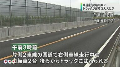 18日午前3時前、習志野市谷津の片側2車線の国道で、右側の車線を走っていた2台の自転車が後ろから走ってきたトラックに相次いではねられました。この事故で、自転車に2人乗りしていた男女と、別の自転車の男性のいずれも10代とみられる3人が、頭などを強く打つ大けがをして、病院で手当てを受けています。