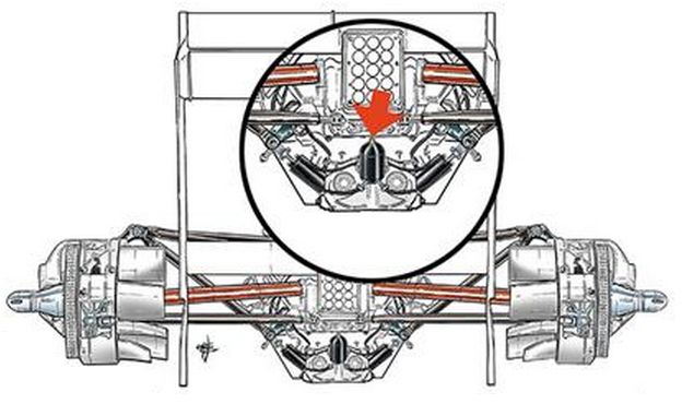 詳細画像では、前のふたつの赤い矢印は、メインのアキュムレータと、フロントとリアのサスペンションを接続するコントロール・マニフォールドの位置を示している。後ろのふたつの赤い矢印は、右リアのアクチュエータと中央アキュムレータの位置を示している。