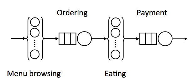 次に、レストランのスタッフと顧客の動きをキューモデルに従って分解。
