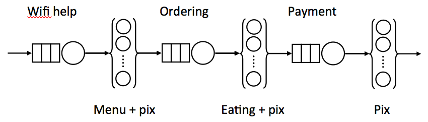 - 顧客が注文をする。ウェイターが対応するので、PDQモデルにおいては、ウェイターをservice facilityと定義して、キューに溜まって処理されるアクションになる。