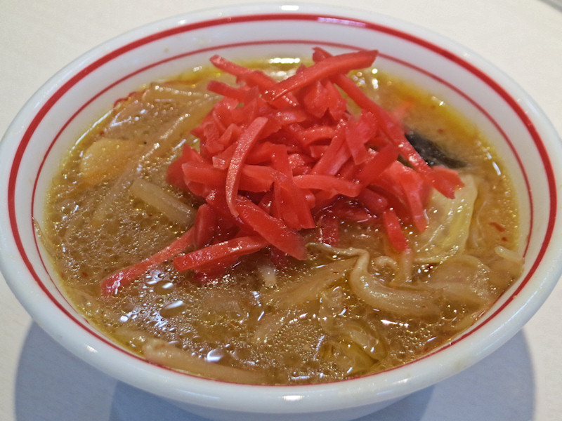 途中で味噌タンメンスープ、正式料理名は「プチスープ(味噌)」ですが、にわか中本ファンとしては「味噌タンメンスープ」、煮込まれた野菜とピリ辛の味噌スープが美味しいです。
