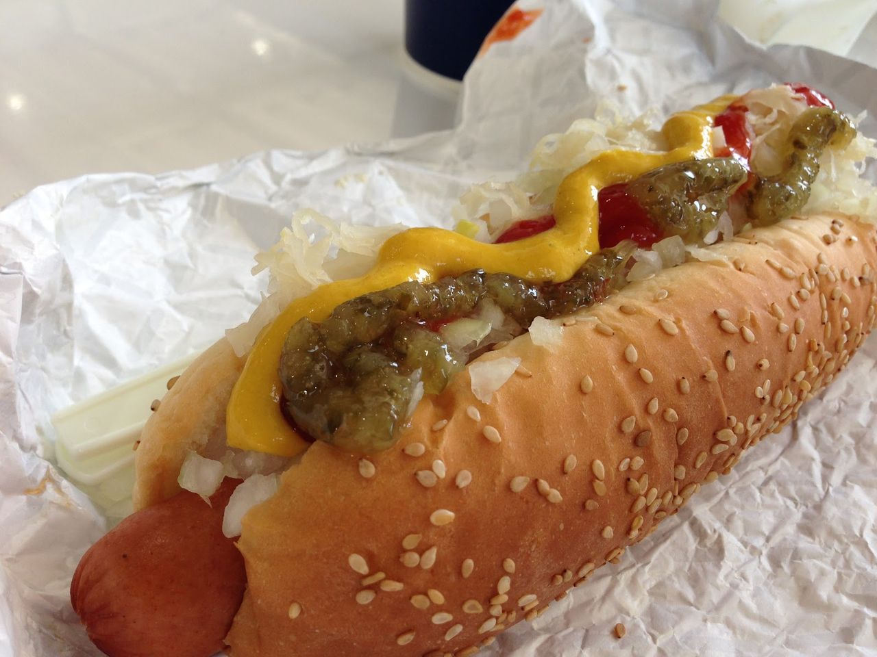 欲張ってピクルス、オニオン、ケチャップ、マスタードをドカ盛りしたら塩っ辛くて食えんかった。