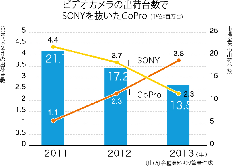 このゴープロ社は2014年6月26日、米ナスダック市場でのIPO(新規株公開)を果たした。申請時に公開された資料によって11年が114万台、12年231万台、13年384万台と、これまで公表されなかったゴープロシリーズの出荷台数が明らかになった。ソニーの業績資料によるとソニーのビデオカメラは、対照的に12年370万台、13年230万台となっているから、昨年のうちにゴープロ社が台数ベースでソニーを抜いてビデオカメラ市場のトップに躍り出ていたことになる。米調査会社IDCの資料から得たビデオカメラ全体の出荷台数とともにグラフにしてみた。
