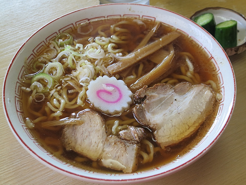 程なくして喜多方ラーメン600円、ほう、キュウリの浅漬けが付いてくるんですね。