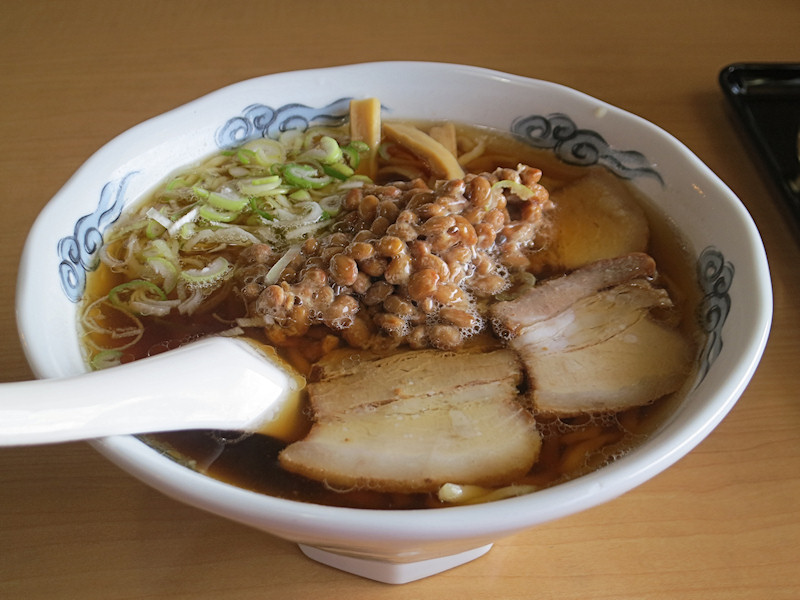 トッピングは標準的なチャーシュー三枚、メンマ、薬味ネギ、なるとは納豆に替わったのかな。