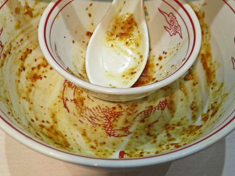 さらに茹でモヤシ、貝割れ大根、薬味ネギ、細かく砕いたフライドガーリックが乗せられいて、かき混ぜて食べると私程度の味覚では何と表現していいのか分からない味。