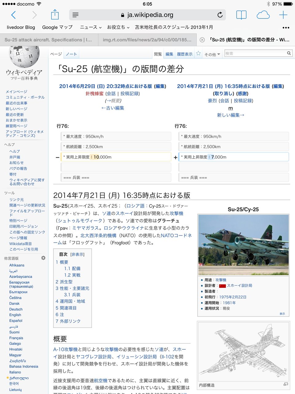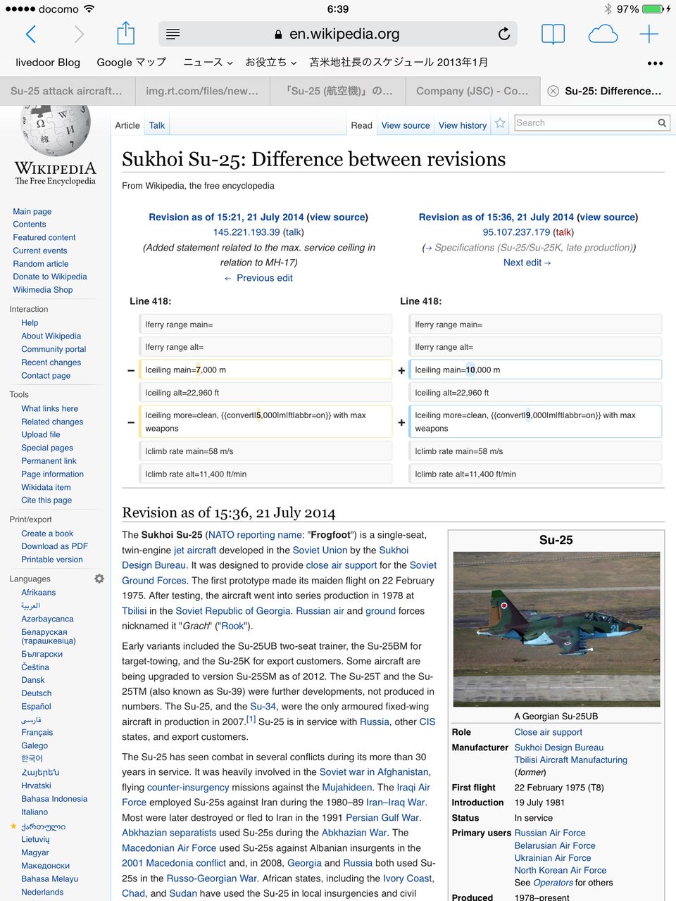 実際は、最新鋭のSu-25Tでなくても、ウクライナも持っているSu-25UBM1などはボーイング777がレーダーから消えた高度33000フィート(10000m)を飛べるし、時速970km出るのに、何でそういう書き込みがと思ったら、ソースはWikiだった。7月21日に欧米メディアで地対空ミサイル撃墜説が有力になるのに合わせるかのように、英語と日本語のWikiで、Su-25の上限高度が10000mから旧式機種の7000mに変更されていた。何らかの政治的背景があるように見える。その頃から欧米でSu-25では高度から無理との報道がされている。そういうのを読んだ人が、書き込みをしてくるようだ。