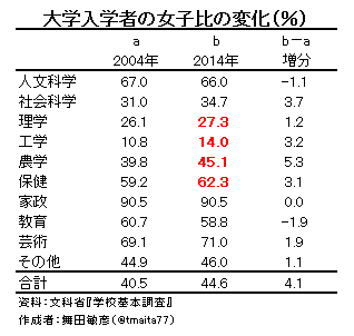 2014年の理系専攻の数値を赤字にしましたが,10年間で微増というところですね。でも農学なんかは,39.8%から45.1%へと5ポイント以上増えてる。あと数年もすれば,半分に達すると見込まれます。結構なことです。