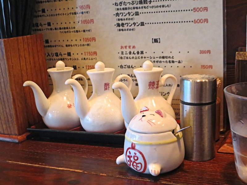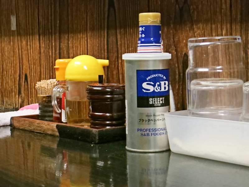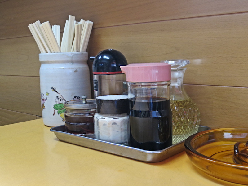 食券を渡して腰を下ろすと、ボトル式の減塩醤油が置かれいていて、おそらくは餃子のタレ用だとは思うけど、(仕入れはボトルであっても)お客様に出す時は容器を移し替えるんじゃないでしょうか。
