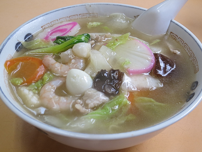 白菜、青梗菜、人参、椎茸、イカ、豚バラ肉、むき海老、なると、かまぼこ、ウズラの玉子、スープ以外は全てオーダーが入ってから料理されている感じで、野菜がきりっとしています。