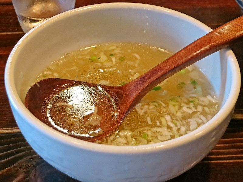 麺を食べ終わってスープ割り、ぱっと刻みネギを入れ足し、ラーメンスープとは別に用意されている割りスープで割って、ご馳走様でした。