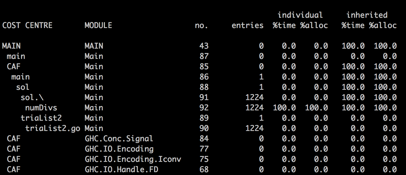 The first problem with the default report is that you only see the top-level profiling information, in our case 100% of the time is spent in numDivs. To drill down to the subexpression level, in order to find which part of the function definition is taking the most time, we need to add the so-called cost centers by hand. When you have big function definitions this becomes very tedious.