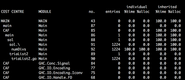 The example above uses an inefficient project Euler solution which was posted on StackOverflow. In order to run the profiling, the code needs a main function. You can find the exact code that is used in this post at https://github.com/djv/VisualProf/blob/master/eu13.hs