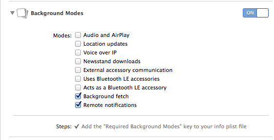 それから、Xcode上からプロジェクトのCapabilitiesの設定をするとき、Background fetchとRemote notificationsの両方の指定がおそらく必須と思われます。中にはRemote notificationsだけ設定しておけば良いと解説しているところもありますが、どうやらRemote notificationsは通知を受け取る箇所までだけで、肝心のバックグラウンドでのデータの取得はBackground fetchがないと実行できないのではないかと思われます。