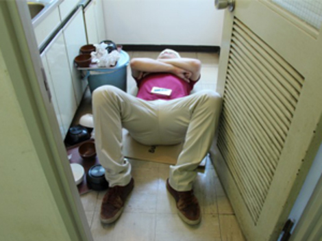 オフィスの奥でダンボールを敷き、イヤホンを耳にしながら寝ていた