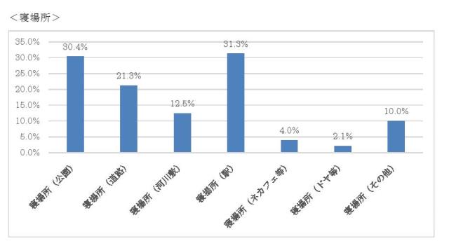 寝場所に関しては、国の調査と異なる点もあります。公園、道路、その他については変わりないのですが、河川敷が少なく駅近郊が多くなりました。これは東京という地域的な違いによるものだと思います。寝場所の移動は、「常に同じ」と「だいたい同じ」を合わせて、8、9割近くで、やはり国の調査とほぼ同じです。