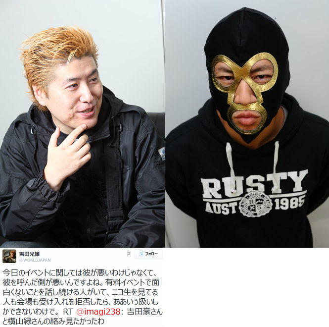 今日のイベントに関しては彼が悪いわけじゃなくて、彼を呼んだ側が悪いんですよね。有料イベントで面白くないことを話し続ける人がいて、ニコ生を見てる人も会場も受け入れを拒否したら、ああいう扱いしかできないわけで。 RT @imagi238: 吉田豪さんと横山緑さんの絡み見たかったわ