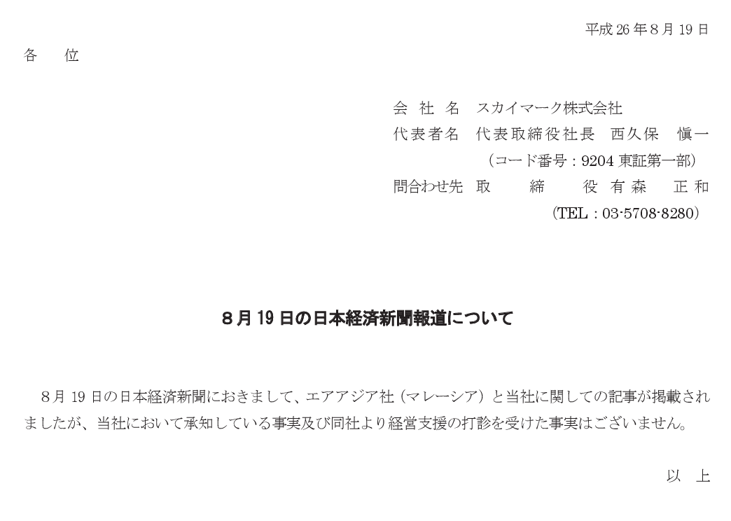 2014/08/19 11:10 スカイマーク 8月19日の日本経済新聞報道について