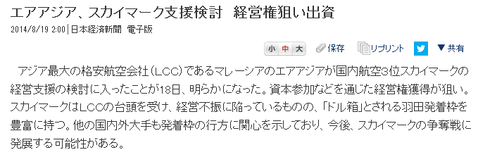 — 日経産業新聞 (@nikkei_bizdaily) 2014, 8月 18スカイマークが大手2社のいずれかの傘下に入れば、その時点で1998年以来の航空規制緩和政策が破綻したことになる。一番需要のある羽田に乗り込んだらデカい奴にボコボコにされた挙句瀕死になって商売になりませんでした、では「新規参入を増やし、競争を促進する」という政策目的は果たせない。