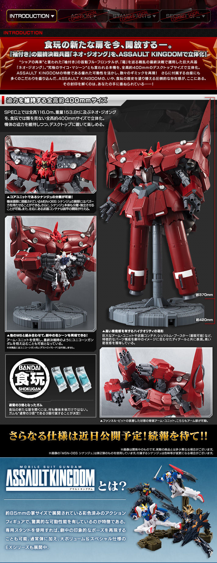 ÀßÄê¾å¤Ç¤ÏÁ´¹â116.0m¡¢½ÅÎÌ153.8t¤ËµÚ¤Ö¥Í¥ª¡¦¥¸¥ª¥ó¥°¤ò¡¢¡ÖASSAULT KINGDOM¡×¤Ê¤é¤Ç¤Ï¤Î¥µ¥¤¥º¤ÇºÆ¸½¡£¿©´á¤Î¥«¥Æ¥´¥ê¤Ç¤ÏÎà¤ò¸«¤Ê¤¤¡¢»Ë¾åºÇÂçµé¤ÎÁ´¹âÌó400mm¥µ¥¤¥º¤ÇΩÂβ½Ãפ·¤Þ¤·¤¿¡£µ¡ÂΤΰµÅÝŪ¤Ê¸ºß´¶¤ò°Ý»ý¤·¤Ä¤Ä¡¢¥Ç¥¹¥¯¤ËÃÖ¤¤¤Æ³Ú¤·¤á¤ëÀä̯¤ÎÂ礤µ¤ò¼Â¸½¡£¥¢¡¼¥à¡¦¥æ¥Ë¥Ã¥È¤Ï¤â¤Á¤í¤ó¡¢ÍÀþ¥Õ¥¡¥ó¥Í¥ë¡¦¥Ó¥Ã¥ÈÉôʬ¤òư¤«¤¹¤³¤È¤ä¡¢Éð´ï¥³¥ó¥Æ¥Ê¤Î³«ÊĤâ²Äǽ¤Ê¤É¡¢¥·¥ê¡¼¥º¤Î²ÄưÀ¤òºÇÂç¸ÂÀ¸¤«¤·¤¿»ÅÍͤǤ¹¡£¥·¥Ê¥ó¥¸¥å¤ÏÏÓÉô¤Î²Äư¤ä¡¢¿·¤¿¤Ë¤·Á¤µ¤ì¤¿ÀìÍѥХº¡¼¥«¤ÎÁõÈ÷¤¬¤Ç¤¤ë¤Ê¤É¡¢ºÙ¤«¤Êºî¤ê¤³¤ß¤¬¤Ê¤µ¤ì¤Æ¤¤¤Þ¤¹¡£¤Þ¤¿Ä̾ï¤Î3ÇܡɤǤ¢¤ë3¸Ä¤Î¥¬¥à¤¬ÉÕ°¤·¤Þ¤¹¡£