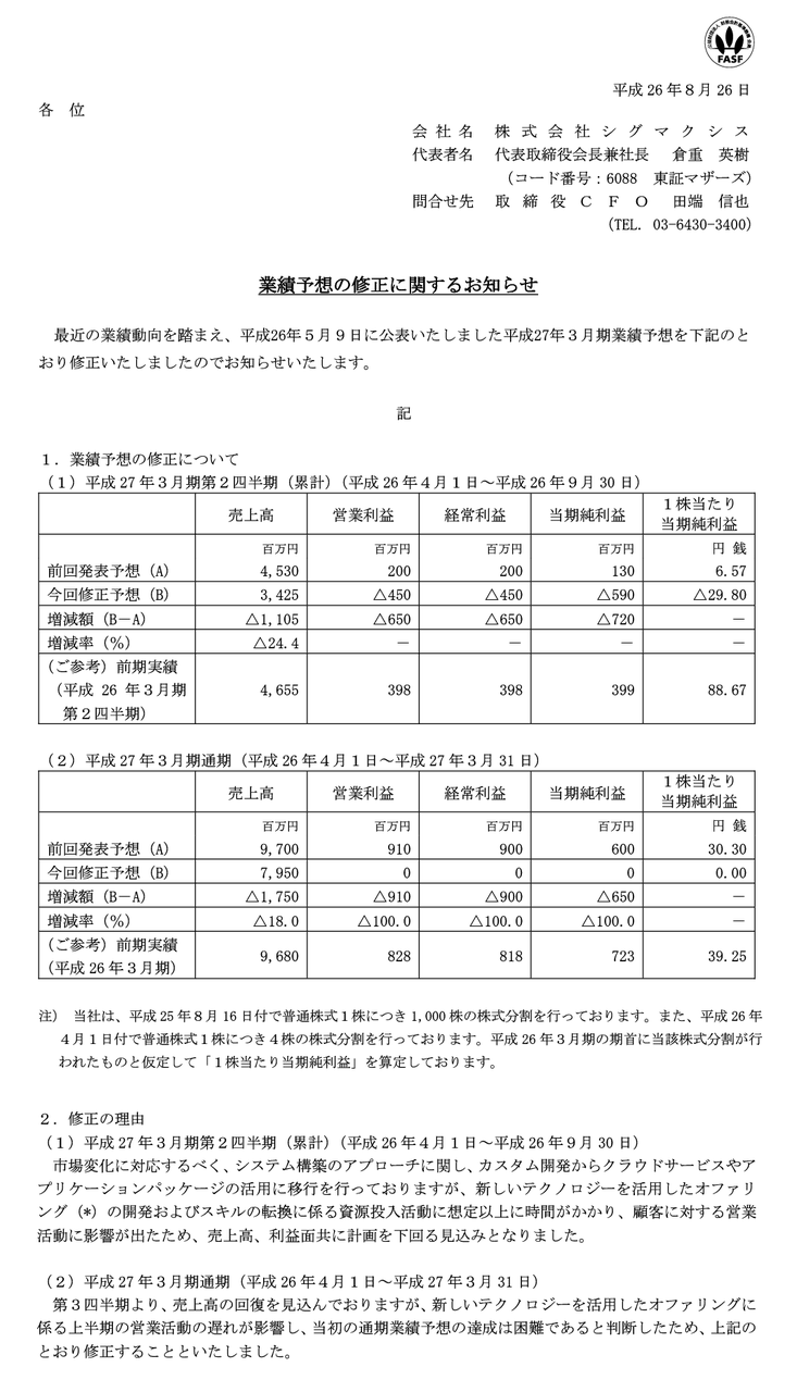 2014/08/26 18:30 シグマクシス 業績予想の修正に関するお知らせ