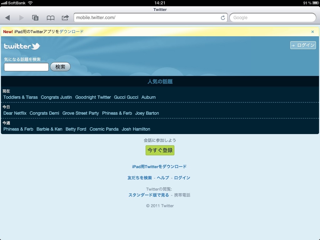 // mobile.twitter.comにUIWebViewからアクセスしたときに、"Get Twitter for iPad NOW"とかなんとか表示されるのを防ぐため、